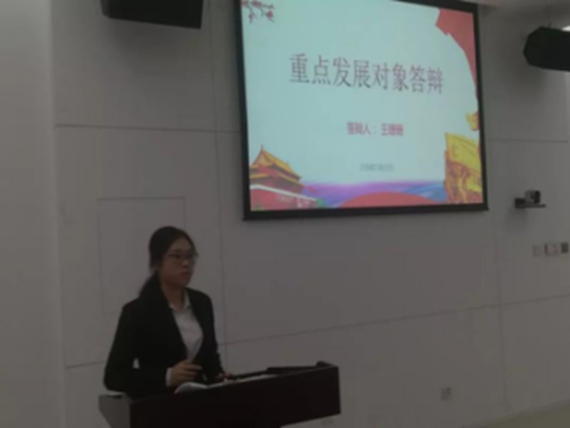 冯佳琪、刘心悦等13位入党积极分子从个人情况、对党的认识、入党动机、自身不足和今后打算等方面进行全面展示。他们向党组织汇报了一年来的学习成果、实践情况和思想理论学习效果,陈述了自己的入党动机以及对党的认识,最后分别选取了一则时事热点,运用马克思主义哲学进行分析,充分表现了大家积极主动学习并运用马克思主义先进思想,向党组织靠拢的意愿和决心。在问答环节,面对与会党员提出的关于社会工作、时事热点和理论知识等多个方面的问题,各位积极分子沉着应对,从容应答,以严谨的语言交上了一份充满智慧与决心的答卷。
