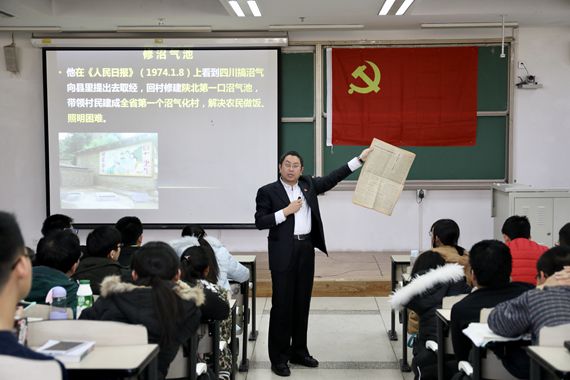 讲到习总书记于1974年1月8日的《人民日报》上看到四川省修建沼气池造福全县人民后进而亲赴四川学习时,高宁老师小心翼翼地拿出已经泛黄的当日的《人民日报》,给我们看第四版关于四川省建沼气池的经验,同学们称赞于高宁老师的认真严谨,惊叹于习总书记的远见卓识。
