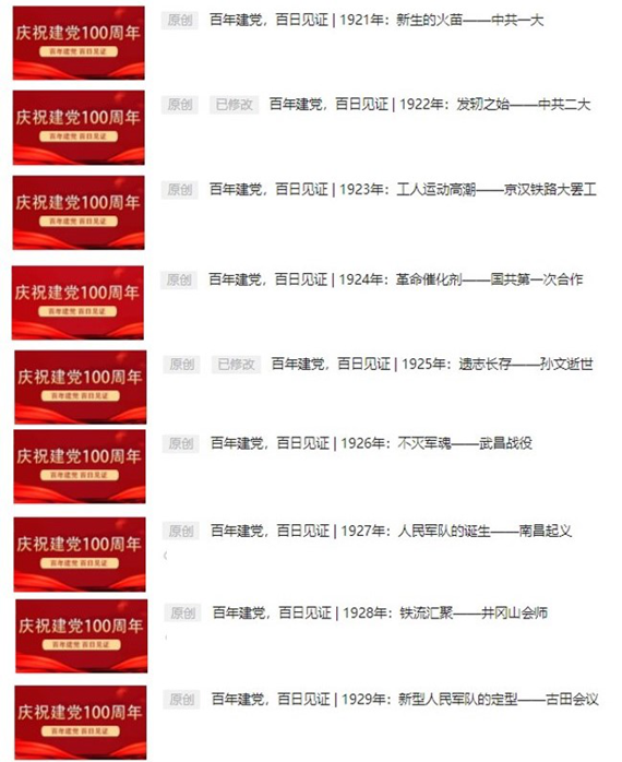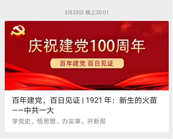 书院学生组成100个学习小组,选出建党100年来的100件大事记,收集并整理相关史料,在7月1日前100天内编写100期推送发布在“冯如远航”公众号上,供全院师生学习分享,学习覆盖率100%。