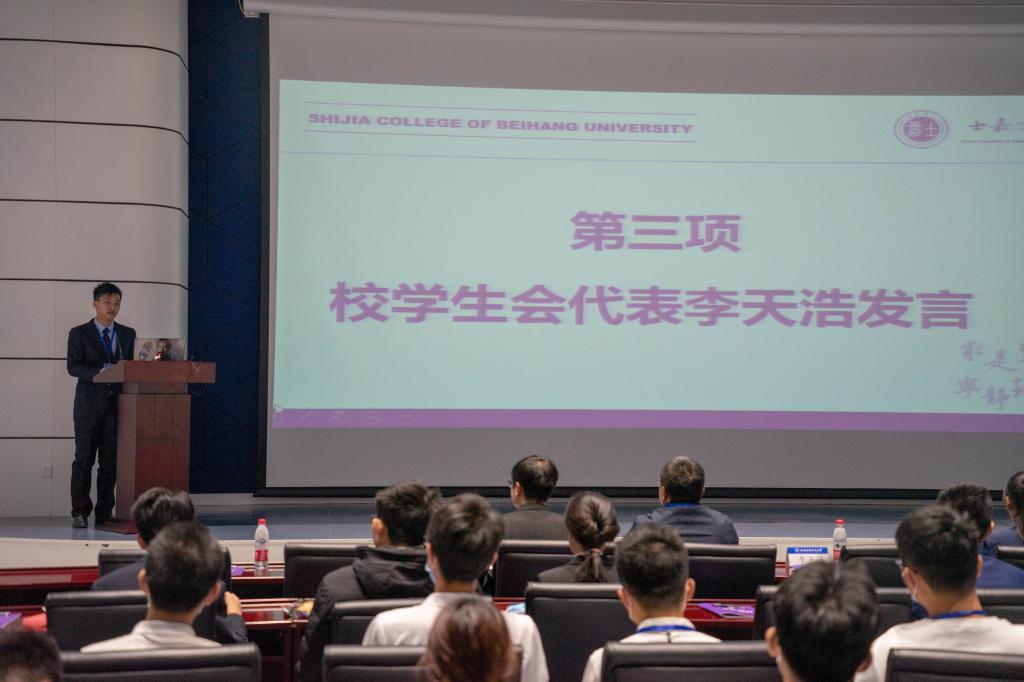 校学生会代表李天浩同学发言。他代表校学生会向大会召开表示热烈的祝贺,并充分肯定了士嘉书院学生会在过去一年内为学校和书院建设发展做出的卓越贡献。他提出,学生会要积极探索“学校、书院、班级”三级联动工作格局,着力提升学生干部的服务意识和履职能力,紧跟新时代,把握新形势,积极担当作为。