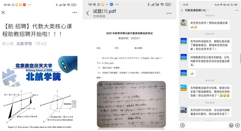 8月18日,19名补报代数组助教的同学以网上面试的方式,参加了工科高等代数与线性代数类助教选拔的补选考核。在这一面试过程中,博士生钟世红同学终于为北航研究生扳回一局,表现优异,对面试问题对答如流,充分展现了北航数学研究生应有的本科代数功底;本科生郭慧珍、岳泽阳、李裴林表现也非常突出。