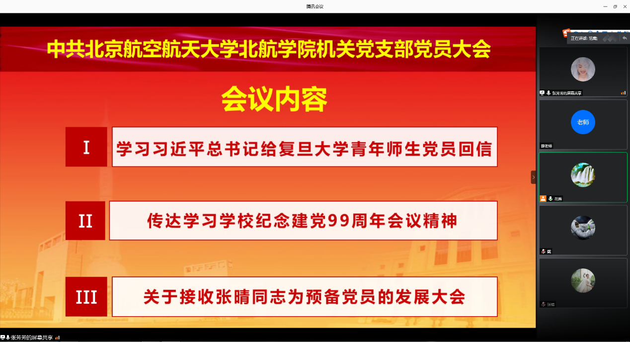 此次全体党员大会主要三个内容,一是学习习近平总书记给复旦大学青年师生党员回信精神;二是传达学习学校纪念建党99周年会议精神;三是接收张晴同志为预备党员的发展大会。