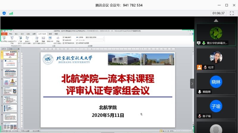 (通讯员 郝彩林)为响应教育部一流课程建设“双万计划”号召,落实学校打造一流本科课程的工作部署,金沙集团1862cc橙色积极推进一流本科课程建设工作,于2020年5月11日下午,组织召开了院级一流本科课程评审认证专家组首次线上研讨会。本次会议由北航教务处处长、金沙集团1862cc橙色常务副院长曹庆华主持,来自我校以及清华大学、北京大学、北京外国语大学、华北电力大学等的19名评审认证专家及教学工作部全体人员参加了本次会议。