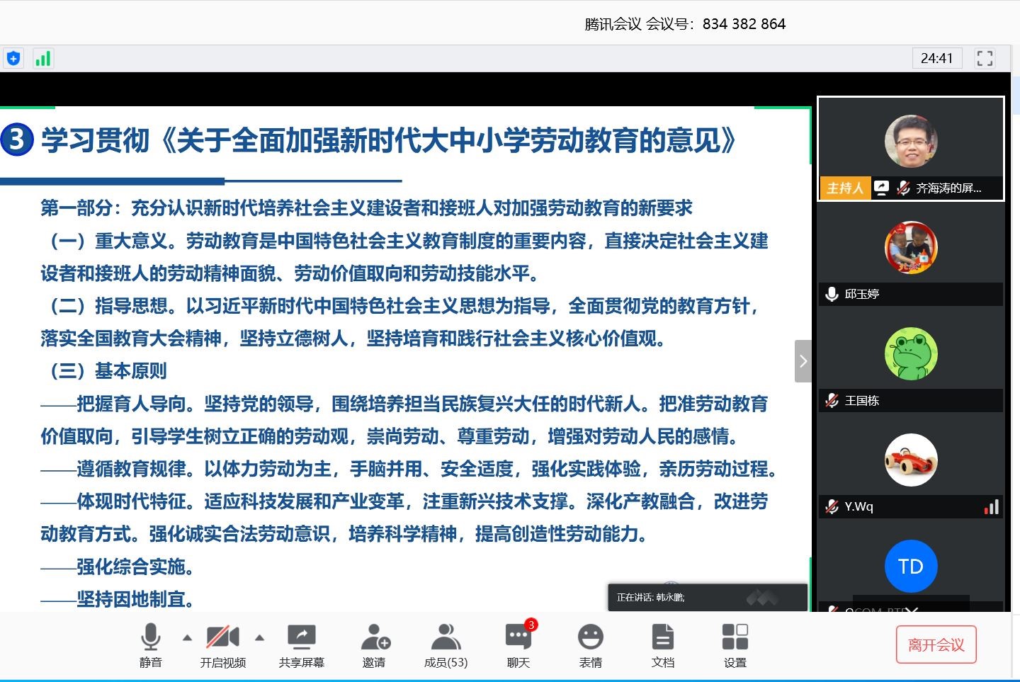 支部组织委员邱玉婷领学了习近平总书记关于疫情防控工作的最新重要讲话精神及中央、上级部门、学校党委关于疫情防控工作的最新工作部署;支部宣传委员李烨领学了习近平总书记给北京大学援鄂医疗队全体“90后”党员的回信;支部纪检委员韩永鹏领学了《关于全面加强新时代大中小学劳动教育的意见》,介绍了文件发布背景和具体内容,引导全体教职工结合自己的工作,探讨对文件内容的理解。与会老师就如何全面加强新时代大学生劳动教育展开了热烈讨论,孙英蛟、赵雷、陈娇娇等6名教师表示在今后的教学工作中要贯穿吃苦耐劳精神的培养,更好地发挥劳动教育的协同育人作用;王虹霞以PPT的形式从文件的学习与理解、实践示例和举措分析等三个方面向大家汇报了学习心得。