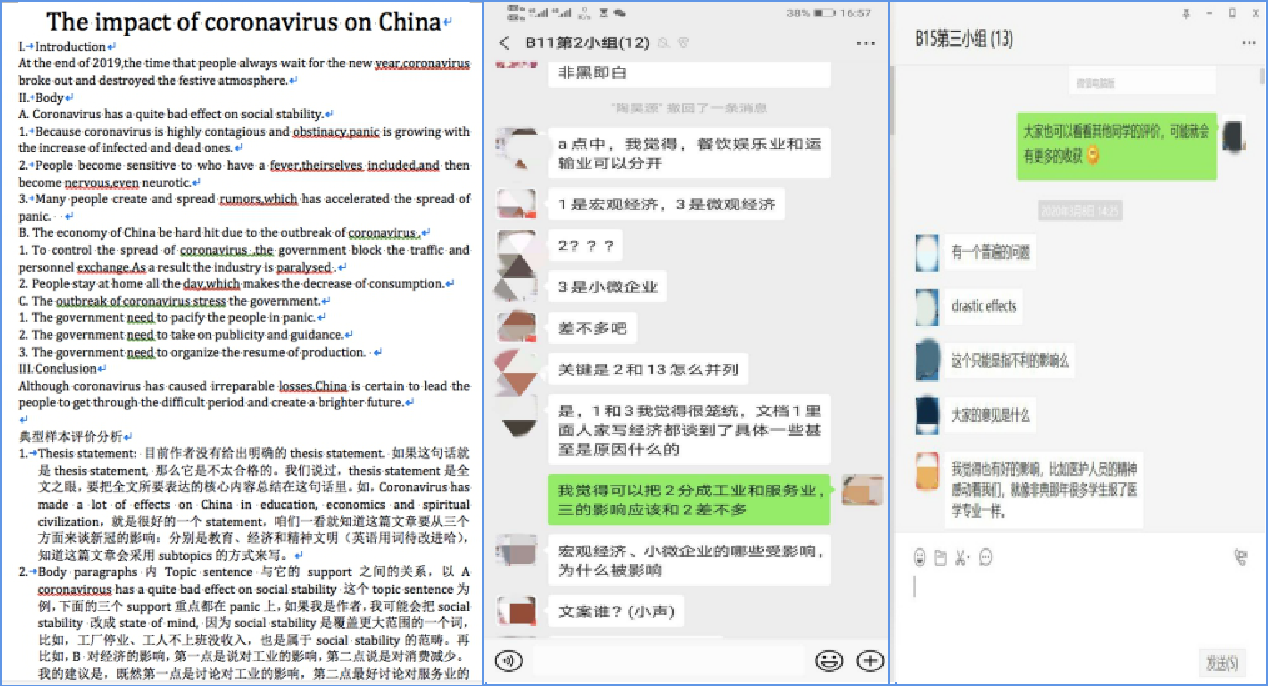 另外,在目前网络教学情况下,充分发挥每种线上技术优势,实现优势互补。比如U校园学习平台为学生提供了听说数字课程;IWrite写作平台助力学生语言问题的修改,方便了学生互评和教师评价;Zoom会议平台方便师生交流和生生交流;微信课程群可以发布各种信息,微信小组群便于开展小范围深入讨论。