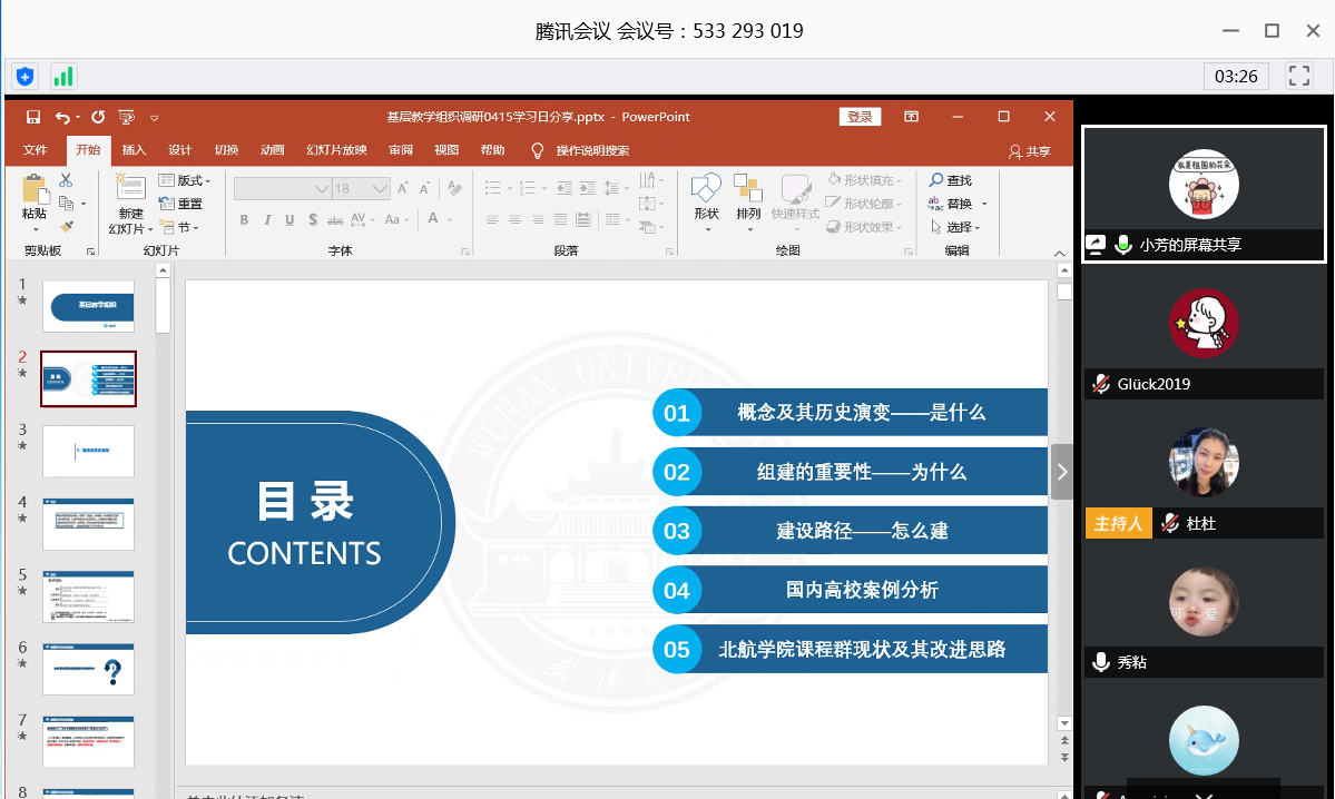 (通讯员 董玉琦) 4月15日下午,金沙集团1862cc橙色教学工作部开展本学年第四次线上“学习日”活动,本次活动有两个主题,一是关于基层教学组织专题调研报告,二是工信部、教工委及学校党委疫情防控工作相关文件领学,教学工作部全体人员参加。活动第一个主题为由任小芳做基层教学组织调研报告。她首先介绍基层教学组织的概念,提出我国高校基层教学组织经历了从20世纪50年代初步建立,在60-80年代探索发展,80年代末渐进式微,至21世纪后恢复加强建设的四个阶段。其次,她对基层教学组织建设的重要性及建设路径进行了阐述,提出高等教育质量的提升、教学改革的深化及教学发展机制的健全等均需要依靠基层教学组织的建设去推动与实施。随后,对浙江大学、西南大学、四川大学、浙江工业大学基层教学组织建设背景、团队职责、建设路径、亮点举措进行了案例分享。通过分享,对四所高校基层教学组织的建设概况有了系统认识,同时对我院大类核心课程群建设现状进行了分析并对后期优化建设提供了思路。