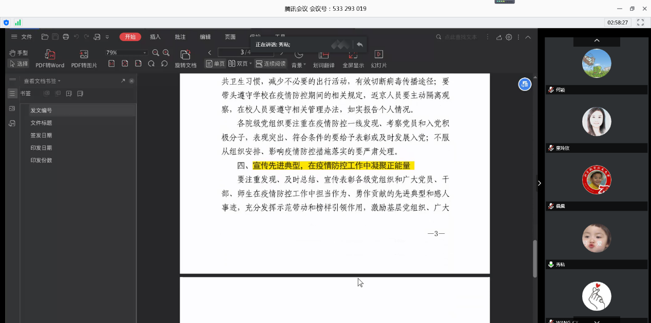 会议的第二个主题为:薛秀粘带领大家依次学习了《工信部:关于在新型冠状病毒肺炎疫情防控工作中充分发挥基层党组织战斗堡垒作用和党员先锋模范作用、力戒形式主义官僚主义的通知》、《教工委转发:中共北京市委关于加强党的领导、为打赢疫情防控阻击战提供坚强政治保证的通知》、《北航党委:关于在打赢疫情防控阻击战中充分发挥基层党组织战斗堡垒作用和党员先锋模范作用的通知》。以上通知强调,在疫情防控工作中要充分发挥基层党组织战斗堡垒作用和党员先锋模范作用、力戒形式主义官僚主义;要提高政治站位,切实增强坚决打赢疫情防控阻击战的责任感和使命感;要激励引导各级领导干部挺身而出、担当作为;要坚持真抓实干,凝心聚力支援疫情防控斗争第一线;要宣传先进典型,在疫情防控工作中凝聚正能量。