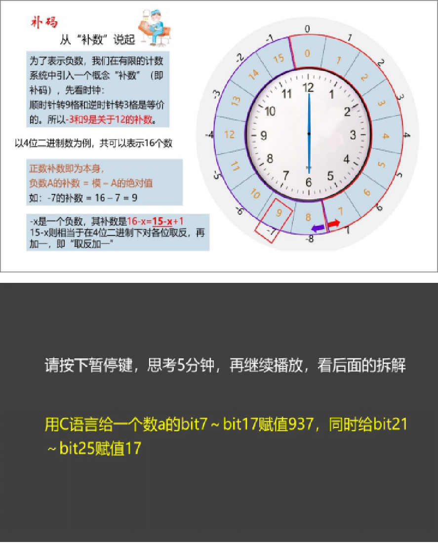 从内容上,对原有PPT中的关键知识点和难点,进行了逻辑上的再设计,力求深入浅出。比如关于补码的知识点中,-128的补码对于学生来说比较难理解,课程团队巧妙地引入补数的概念,设计了一个生活中大家熟悉的时钟的补数的例子,从时间的补数讲到计算机的补码,从补码的来源讲到补码的优点,把补码的问题就说清楚讲透彻了,让学生知其然并知其所以然,豁然开朗。