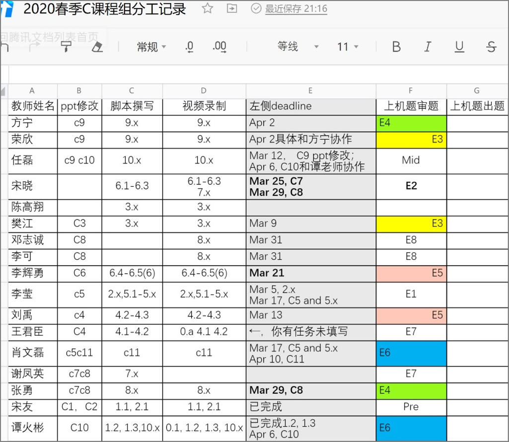 要完全发挥课程团队集体的力量,就需要瞄准目标,齐心协力、分工合作、各展所长。课程团队借助各种在线协作工具共同完成各项在线教学任务,比如在原有教案的基础上,“知识点范围再明确,知识点细节大讨论、知识点精华深总结”,瞄着这个目标,由2-3个教师组成一组,分章对各部分细节项目和内容进行研讨,力求打磨出线上一流课程。