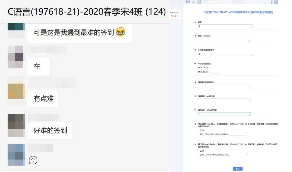 为了督促学生能够观看录播课,把握学生学习进度,课程团队还采用了特殊的“签到”仪式,即学生在有限的时间内完成若干道基本知识点的回答,才算完成了签到,有效帮助学生复习和巩固了知识点。经过几次签到,这些知识点学生想不记住都难,小小签到,四两拨千金。