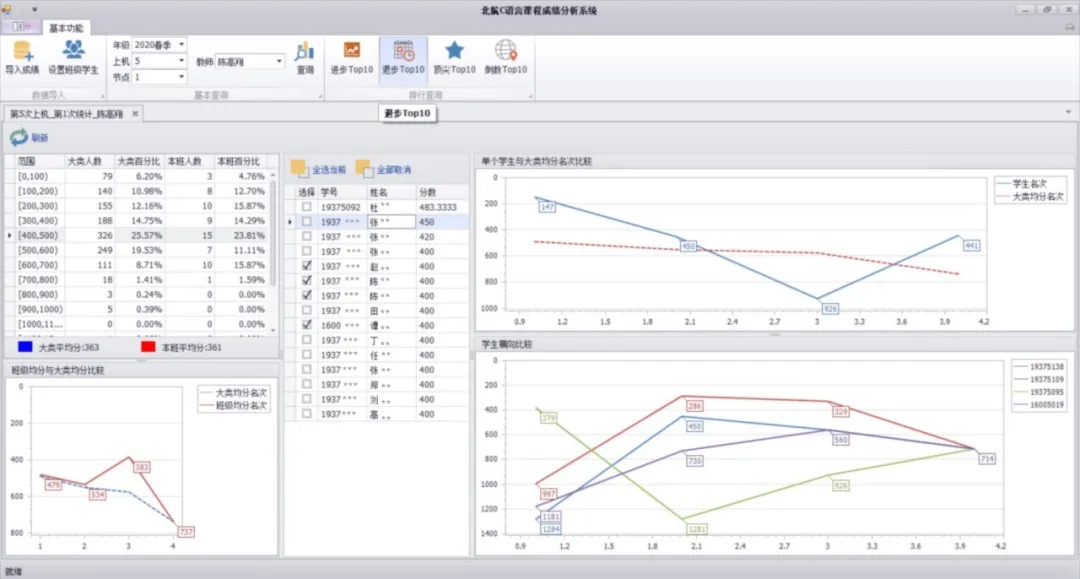针对不同分数段的每个学生,对学生的学习动态进行掌握。采用单个学生的每次上机编程评分名次与平均分名次的相对检验法,把学生的成绩历史直观统计出来。