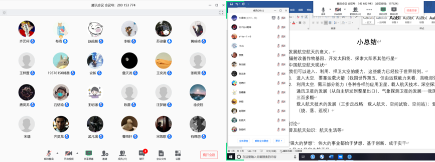 节目结束后,各小班在守锷书院的要求下组织进行了班会,在线上分享自己收看节目后的感悟和思考,交流自己观看节目后对航天精神的理解。