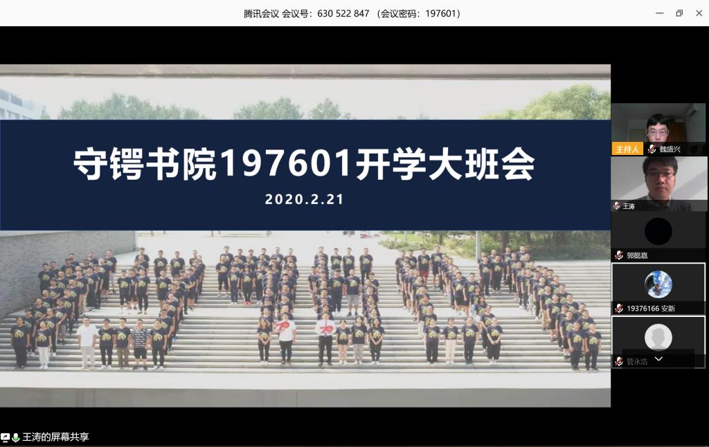 (通讯员:魏盛兴)疫情汹涌,却阻挡不住春天的脚步。为进一步落实学校“停课不停教、停课不停学”的相关工作部署,引导学生正确认知当前抗疫形势,为新学期开学做好准备,2月21日上午10:30,守锷书院第一、二、三大班分别召开了2019-2020学年春季学期线上开学大班会。会议由辅导员王涛、魏盛兴,王琳、朱立鹏,关天洋分别主持。
