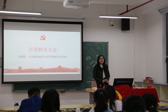 党课正式开始,王聪聪老师为我们带来了主题为“全国教育大会”的沙龙式党课。她概括了于2018年9月10日召开的全国教育大会中的核心内容并分别详细解释它们的具体概念和要求。