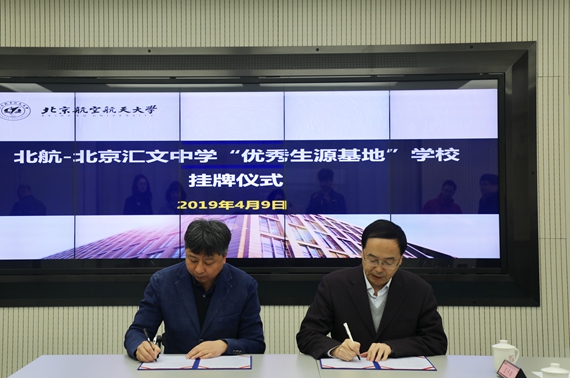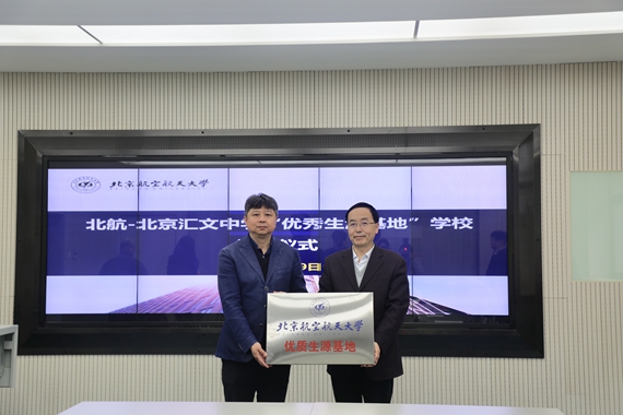 在会议上,郭杰校长介绍了汇文中学基本情况以及办学理念,表示了对北航的人才培养环境和理念的肯定,并希望进一步与北航展开合作,为北航输送更优质的生源。马进喜处长简要介绍了北航办学及人才培养基本情况,表示要接好人才教育的“接力棒”。随后,双方针对中学生的大学专业选择和职业生涯规划指导展开深入交流,并举行了“优质生源基地校”协议签约仪式,马进喜处长为汇文中学颁发了“优质生源基地”牌匾。