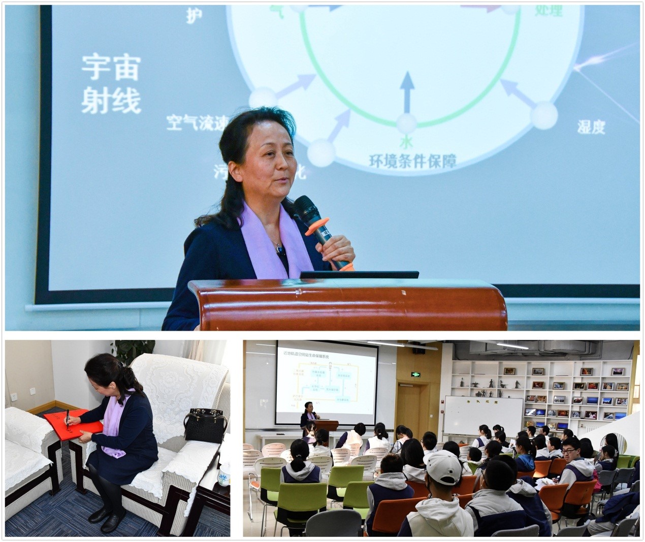 会谈结束后,刘红教授以《太空生存》为题给十一学子带来了主题报告。刘红教授从高中生可以接受的基础生物理论知识讲起,逐步扩展到生命保障系统理论和“月宫一号”的研究历程。刘红教授鼓励同学们要从“全球”乃至“宇宙”视野看待问题,通过创新不断完善自身,精彩的讲述深深吸引了在场每一位同学和老师,不时的提问交流更是让现场气氛热烈异常。报告最后,刘红教授又介绍了北航的学科特色和专业优势,鼓励同学们报考北航!