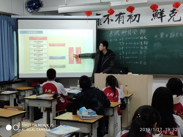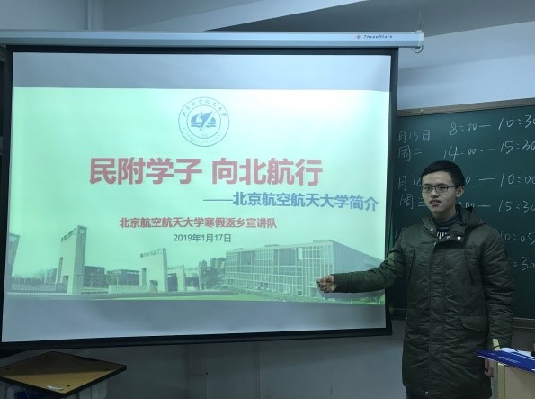 2019年1月29日,鉴于之前已经组织过一次统一的宣讲,为节省广大高三同学的宝贵时间,实践队队员们决定面向高三年级的活动以面对面的经验交流为主,辅以张贴海报、资料分享以及分发自制明信片等,让那些对北航有一定兴趣的学弟学妹及家长对北航有更深的了解,让高三学生能够知晓北航的优势、了解北航的发展建设趋势。
