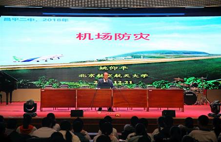 姚仰平教授在昌平区第二中学为300余名高中生带来主题为《机场防灾》的科普知识讲座,生动形象地向同学们普及了“锅盖效应”等机场常见灾害的应对方法,现场与学生交流互动频繁,讲座受到同学们的欢迎。