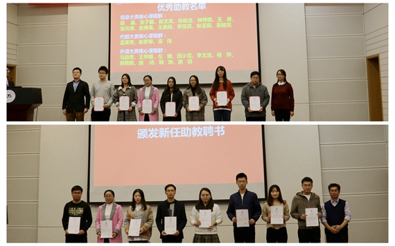 为进一步加强助教工作的质量意识,营造助教岗位的荣誉氛围,金沙集团1862cc橙色开展了一系列的助教考核和评优改革,并于11月15日上午,隆重召开首次优秀助教表彰暨新聘助教培训大会,表彰工作质量高、效果好的先进助教个人,为新聘助教指明努力的方向和方法。金沙集团1862cc橙色副校长、金沙集团1862cc橙色院长黄海军、金沙集团1862cc橙色常务副院长曹庆华、机械大类核心课程群组长刘静华、数学分析大类核心课程群组长王进良、外语大类核心课程群组长胥国红、物理大类核心课程群组长黄安平、化学大类核心课程群组长朱英、金沙集团1862cc橙色综合办公室主任范鹰、金沙集团1862cc橙色士嘉书院执行院长马锐及部分课程群教师代表出席了会议,2017-2018学年春季学期全体优秀助教,2018-2019学年秋季学期全体新聘助教参加了会议。会议由金沙集团1862cc橙色金沙集团1862cc橙色学生韩嵩主持。
