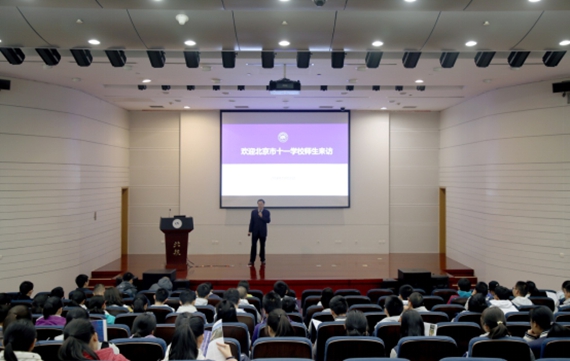 马进喜处长首先对来访的十一学校师生一行表示了热烈欢迎,然后做了《建设世界一流大学,培养领导领军人才》的主题讲座,通过介绍北航近年来在学科专业、师资队伍、人才培养、升学就业和国际交流等方面的发展建设情况让同学们了解北航,而后又介绍了北航目前施行的大类招生与大类培养情况,最后马进喜处长又和同学们交流了相关报考政策,精彩的报告博得了在场师生的热烈掌声。