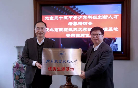 10月25日上午,北航招生就业处、北京招生组一行走进北京市第三十五中学,双方举行北航“优质生源基地”合作协议签约及挂牌仪式。北航招生就业处处长马进喜、副处长张青竹,北京招生组冯如书院执行院长高静,航空科学与工程学院教授关志东,三十五中校长朱建民、书记孔燕、副校长黄鹏等共同参加了座谈会及签约授牌仪式。