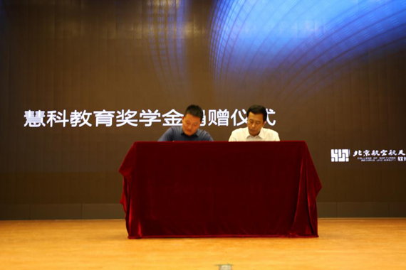 接下来,软件学院党委书记张德生代表学院接受了优秀院友企业——慧科教育的奖学金捐赠,并进行了签字仪式,这不仅是院友对学院的回馈,更体现了一个企业的社会担当。慧科教育CEO岳喜伟和软件学院党委书记张德生发表讲话,表达了对学子们的殷切期待和衷心祝愿,激励学生不断奋进。
