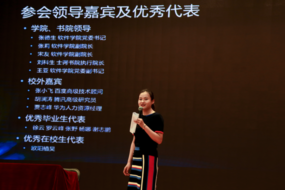 在20分钟的中场休息里,同学们在咏曼剧场内参观了软件学院特色展板和优秀学生创新创业团队的科技作品展示,了解了软件学院的风采,并对感兴趣的科技作品进行了询问。中场休息结束,来自百度的高级技术顾问张小飞、来自华为的软件工程人力资源经理贾志峰和来自腾讯的高级研究员、微信搜索团队负责人胡澜涛分别做了有关报告,向同学们讲述了在当今的时代背景下,软件与互联网行业的巨头们都在关注什么,软件行业的发展趋势是怎样的,行业和企业急需什么样的人才,以及这三大企业与软件学院的合作与支持。然后,6名软件学院优秀毕业生与同学们面对面进行了交流,他们进入了各行各业,都有着非常杰出的表现。他们分别从自己目前从事的行业出发,讲述了软件学院的支持与帮助,以及自己在软件学院的求学经历。同学们深有感慨,并与他们进行了交流。最后,软件学院党委副书记王亚总结软件学院是一个富有朝气、充满友爱的大家庭,也是一个将创新精神与文化底蕴厚植于血脉的优秀学院,欢迎同学们加入软件学院,共同描绘美好未来!在报告结束之后,老师们与同学们合影留念。
