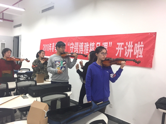 老师为同学们一一指导了拉琴的姿势,在轻松活泼的课堂气氛中为今后的小提琴演奏打下坚实的基础。在同学们一次次的练习中,时间不知不觉就流逝了,下课后同学们仍不愿离开,直到练习到自己满意了才恋恋不舍地收好琴离开教室,大家都希望能尽早迎接下一堂课让自己的小提琴演奏水平更上一层楼。