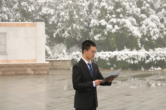 接着全体学生肃立于纪念碑前,向为中国人民解放事业英勇献身的革命烈士默哀。随后,夏宇辰同学代表冯如书院宣读祭文:“北航后生,谨具馨香之奠,致祭于先烈灵前。万余忠魂留芳异乡,正义之师祝捷奏凯。托今世之哀思,以缅先烈之灵冢。奏黄钟之大吕,以广革命之传统……”。