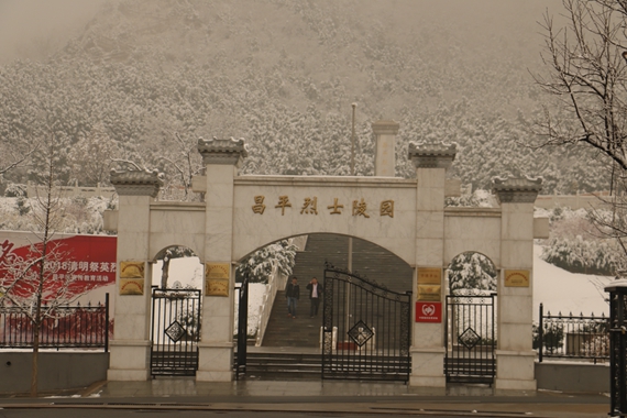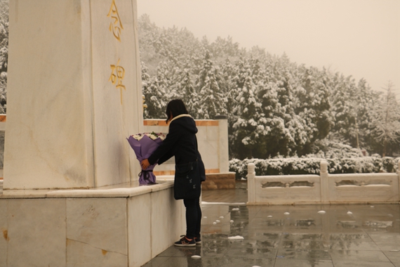 “桃花红雨英雄血,碧海丹霞志士心。今日神州看奋起,陵园千古慰忠魂”,烈士纪念碑在皑皑雪景中愈发肃穆