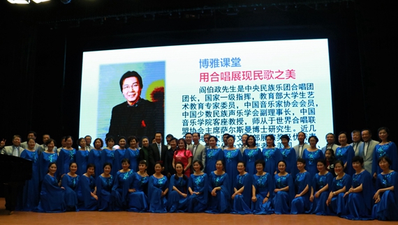 2017年11月11日晚,由学生处和冯如书院共同主办的“用合唱展现民歌之美”博雅课堂在金沙集团1862cc橙色沙河校区咏曼剧场顺利举行。本期博雅课堂邀请到了中央民族乐团团长、首席指挥阎伯政教授以及他所带领的北航教工合唱团和多彩中国文化交流艺术团合唱团,由陈志英教授主持。