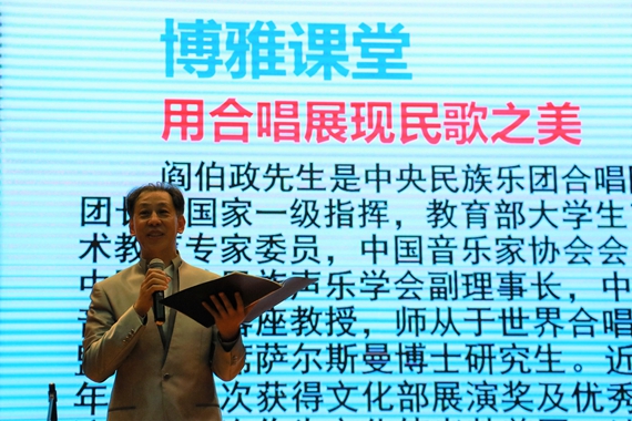 阎伯政教授是中央民族乐团合唱团团长,国家一级指挥,教育部大学生艺术教育专家委员,中国音乐家协会会员,中国少数民族声乐学会副理事长,中国音乐学院客座教授,师从于世界合唱联盟协会主席萨尔斯曼的博士研究生。他不仅在艺术上有很高的成就,在历史人文方面也有独到的见解,对中国民族歌曲的演变与特色的分析诠释深入浅出,令人印象深刻。