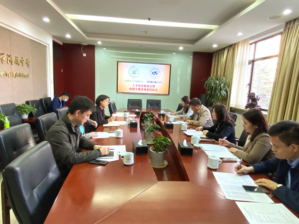 北航招生就业处处长邓怡、士嘉书院执行院长王雷华、学校招生就业处和北京招生组相关人员同首师大附中校长沈杰、校长助理任海霞及相关教师进行了座谈交流。邓怡首先介绍了北航近年来在人才选拔和培养工作中的情况,并分享了学校今年在招生专业设置以及强基计划等方面的一些调整,期待未来能够吸引更多首师大附中的优秀学子报考北航。沈杰介绍了学校的发展历程以及突出特色,阐述了学校一直以来传承的育人理念,并表示了对于双方开展协同育人合作的高度支持。随后,双方举行了“优质生源基地”协议签约及挂牌仪式。