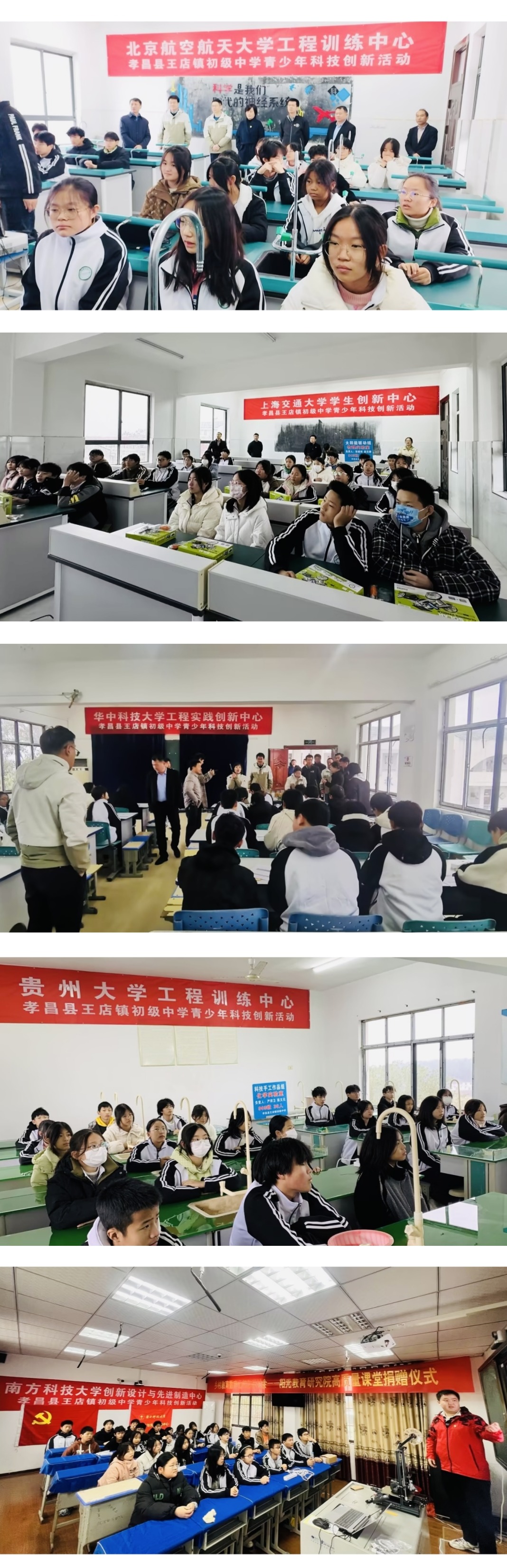11月11日上午,五校工训中心齐聚湖北省孝昌县王店镇初级中学,开展以“科技成就辉煌,创新引领未来”为主题的“同访一所中学”科技创新活动。孝昌县王店镇党委书记王述勇出席活动并致辞。华中科技大学驻孝昌县王店镇东河村工作队以及来自五校工训中心和孝昌县王店镇初级中学的师生200余人参加活动。