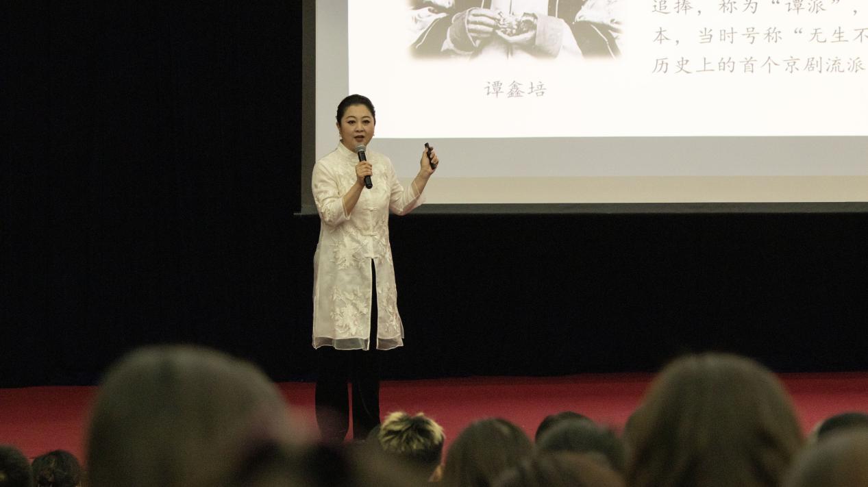 谭茗心老师从京剧起源讲起,结合梅兰芳,谭鑫培先生的事迹,介绍了京剧的发展历程,展示了京剧“四功”——唱、念、做、打,以及“四大行当”——生、旦、净、丑。她强调,京剧集综合性、虚拟性、程序性于一身,融众戏剧精华于一体,能在有限舞台呈现复杂场景,遵循各行当表演范式,无愧“国粹”之名。