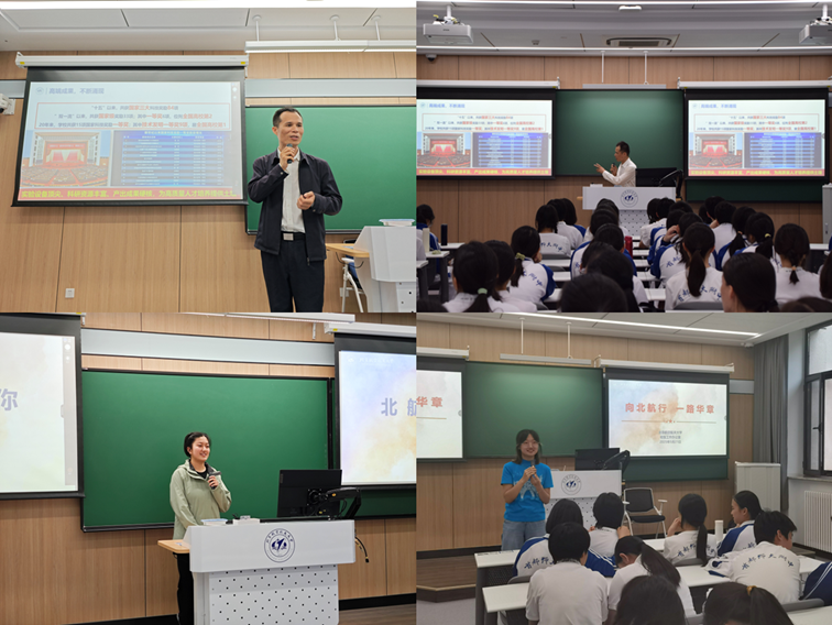 首先,士嘉书院团委书记申永超老师面向全体来访师生作北航招生主题宣讲。申永超从北航的历史沿革、发展现状出发,系统介绍了学校在“双一流”建设、学科布局、人才培养及科研成果方面的突出优势,重点解读了北航的招生专业设置、大类招生等相关招生政策,帮助同学们建立起对北航的全面认知。之后,首师附优秀校友、现北航2023级学生李佳玥、2024级学生刘可欣以朋辈视角与学弟学妹展开交流分享,围绕高考选科建议、北航大类招生下的专业选择、课程体系与特色培养等方面进行深入讲解。在场学生围绕选科方向、课程学习、校园生活等积极提问,交流气氛热烈融洽。