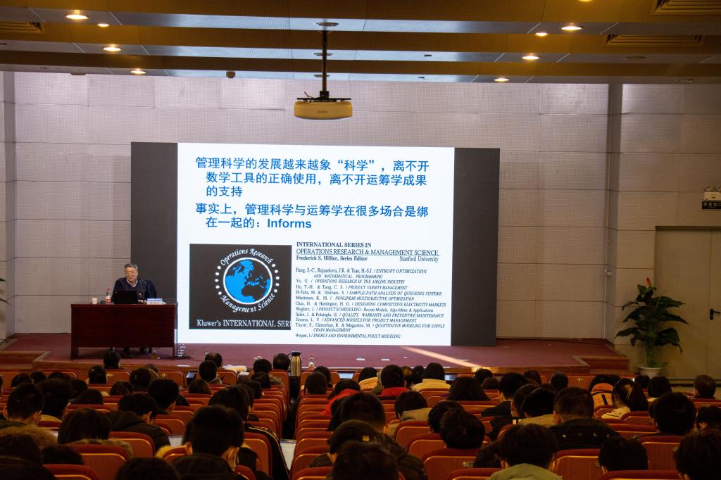讲座中,黄校长围绕“国家发展与管理科学前沿”这一核心主题,从“国家与管理科学”,“数理知识与管理科学”和“管理科学前沿”三个方面对管理科学对国家发展的意义进行深入讲解。他分析了改革开放以来中国各方面的跨越式发展,科普数学知识在管理科学方面的广泛应用,激发了同学们学习报国的使命感以及对数理知识的学习热情。