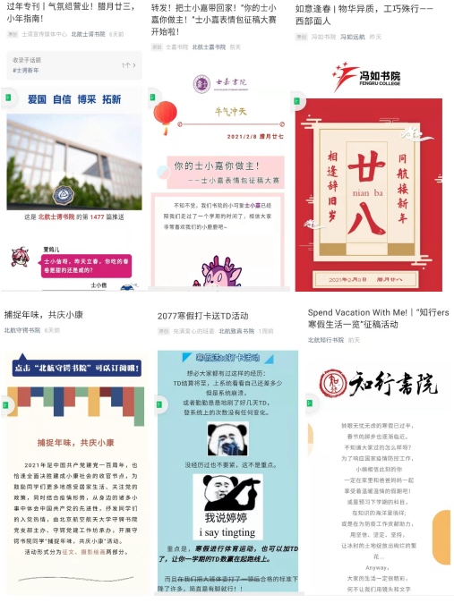 寒假以来,金沙集团1862cc橙色持续关注在校、返乡学生动态,各书院辅导员全覆盖摸排学生情况,开展习惯打卡、传统文化分享、假期生活分享、好书推荐等系列线上活动,丰富学生假期生活,营造温馨、充实、有意义的年味寒假。
