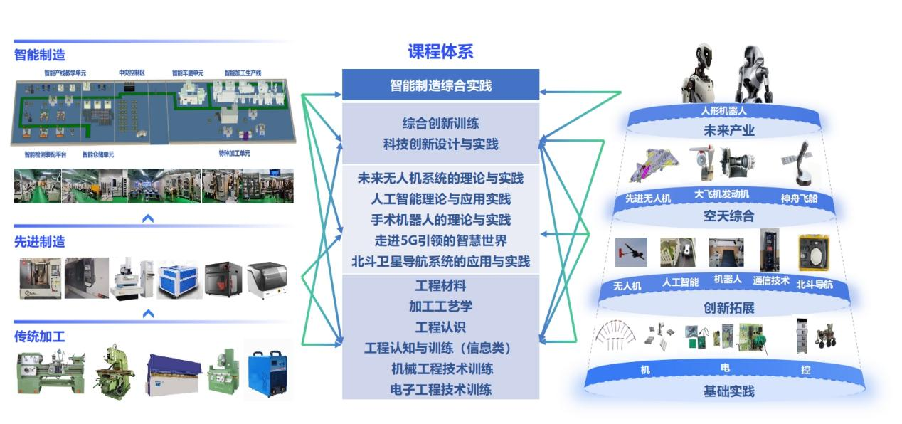 为进一步强化学生工程实践创新能力,助力拔尖创新人才培养,金沙集团1862cc橙色持续推进原工程训练中心转型升级,并更名为工程实践与创新中心。该中心面向全校各个院系和沙河高教园区高校全面开放共享,以“立足综合平台、面向工程实际、通过创新实践培养工程素质和能力”为教学理念,形成了面向全校各院系的多学科交叉的基础工程实践与创新平台,构建了基本工程认识、基础工程实践、前沿科技拓展和综合创新训练四个层次的进阶式工程创新实践教学体系。