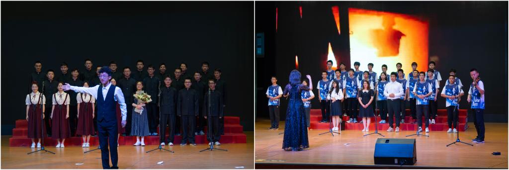 合唱演出的舞台上不仅有同学们的青春阳光,亦有老师们的静谧和善。为了增进师生间的有益联系,营造广大师生上上下下爱党爱国的良好氛围,各支队伍在排演过程都诚挚邀请到了学校的老师们作为助演嘉宾。有对同学们的生活与学业时刻挂念的班主任老师,有在三尺讲堂上谆谆教诲的任课老师,有在科研与专业选择上引导与帮助同学们的学业导师,也有那亦师亦友的辅导员们……来自不同学院,不同岗位的他们,在比赛现场都以嘉士之师的身份,参与到了各支代表队的指导与演唱过程中,和同学们共颂党的百年灿烂与辉煌。