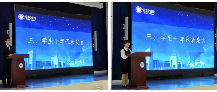 随着庄严的国歌缓缓奏响,大会正式开始。首先,由学生干部代表做主题发言。守锷书院分团委组织部部长何忧分享了自己在过去的一年时间里参与学生工作的感悟,他指出了学生干部应当担起的责任:树立良好的个人作风,做同学榜样、为集体服务;积极工作,架起书院各组织与学生沟通的桥梁;携起手来,合力营造书院的和谐氛围。作为新生的二大班班长李其玲则就当今时代背景,提出了对学生干部重要“三感”——集体荣誉感、责任感、使命感的理解。她认为,学生干部应保持对工作的热情、牢记职责之所在,将个人成长与集体的发展融为一体。