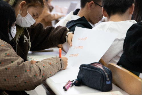 首先,申老师组织同学们分组设计《我的大学》书籍封面,同学们充满热情地描绘出了自己理想中的大学生活并积极分享。高鸿宇组认为,学习是大学生活的第一要务,封面的飞机象征着他对未来的向往和对学业的追求;于航组将校园中的主十字路口映射为人生的十字路口,号召同学们要在学习、生活、个人成长上抓住机遇,做出正确选择;颜书恒组则将图书馆、食堂、操场连成大学生活的铁三角,表达要德智体美劳全面发展。