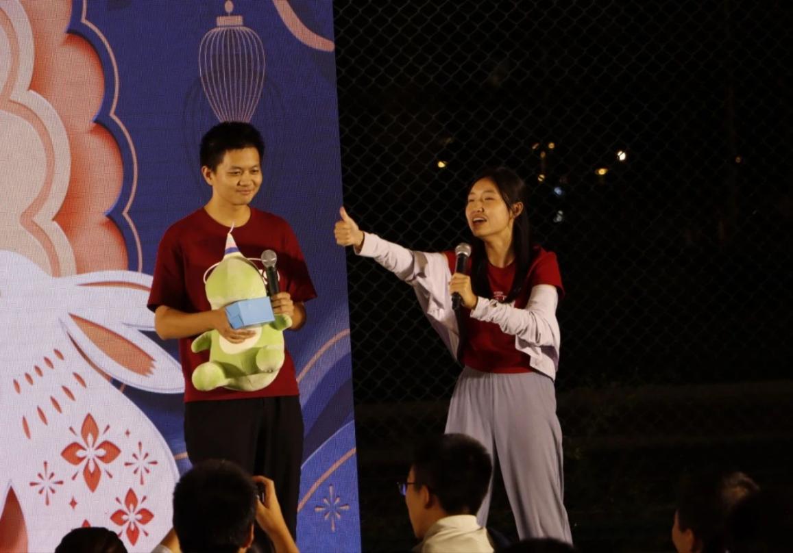 随后是令人期待的抽奖环节。被抽中的幸运儿们上台领取了玩偶奖品。此外,书院还为当日的寿星送上祝福,同学们共同为书院、为寿星们庆生。