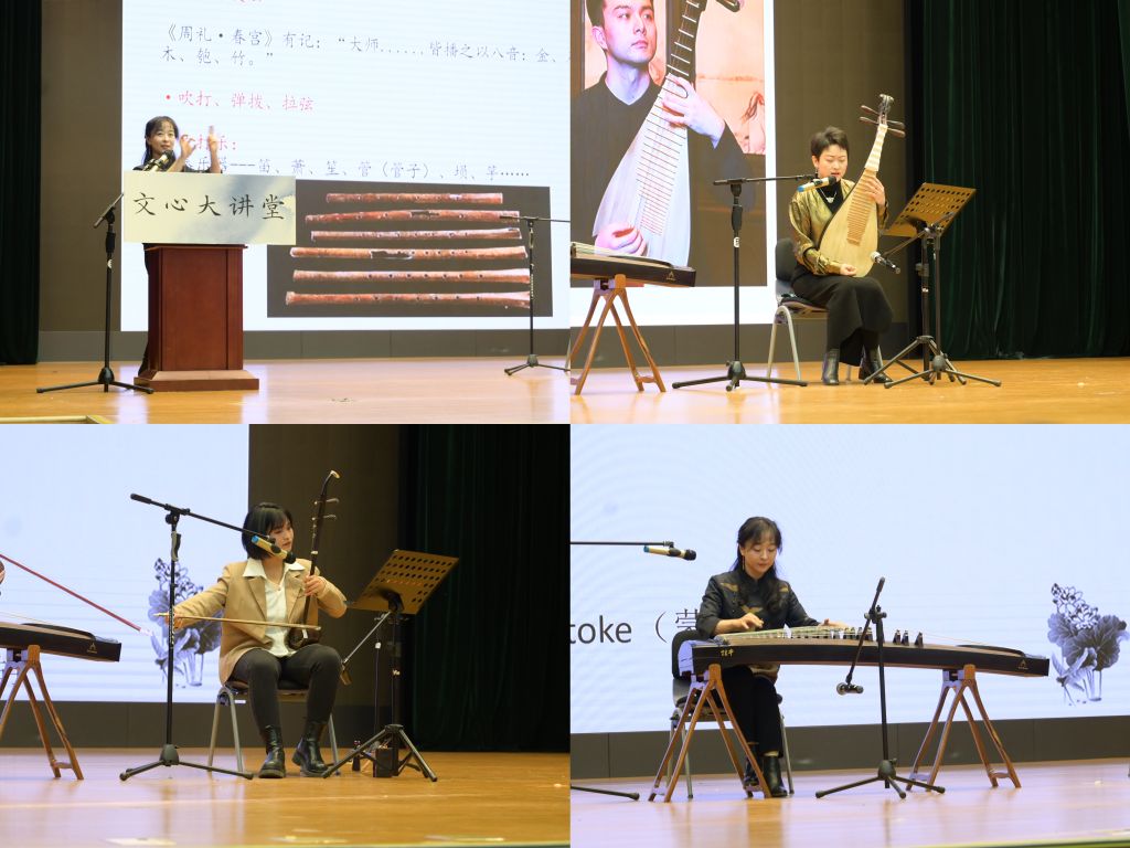 首先,王燮老师追溯中国古典乐器史迹前缘,带领同学共同赏析太空站中国航天员横跨光年万里的琴筝佳音。在演奏环节,王燮老师素手抚琴,以琴声猜索地域,有秦腔恣意,有汉街古韵,亦有浙南婉柔;陈甦超老师现场演绎原创的琵琶曲,一曲趣似方言俚语,一曲唱和伴生,慷慨激昂;庄玥老师则以一曲逍遥胡琴古调,雅俗共赏,使在场诸位恍若置身市井,感受音乐的趣味。课程通过知识梳理、现场演奏以及欣赏分析,引导学生们聆听音乐精品,与圣贤为友,携经典同行,感受中华民族屹立在世界舞台昂首于世的自信与底气,讲演在悠扬的琴声中圆满落幕。