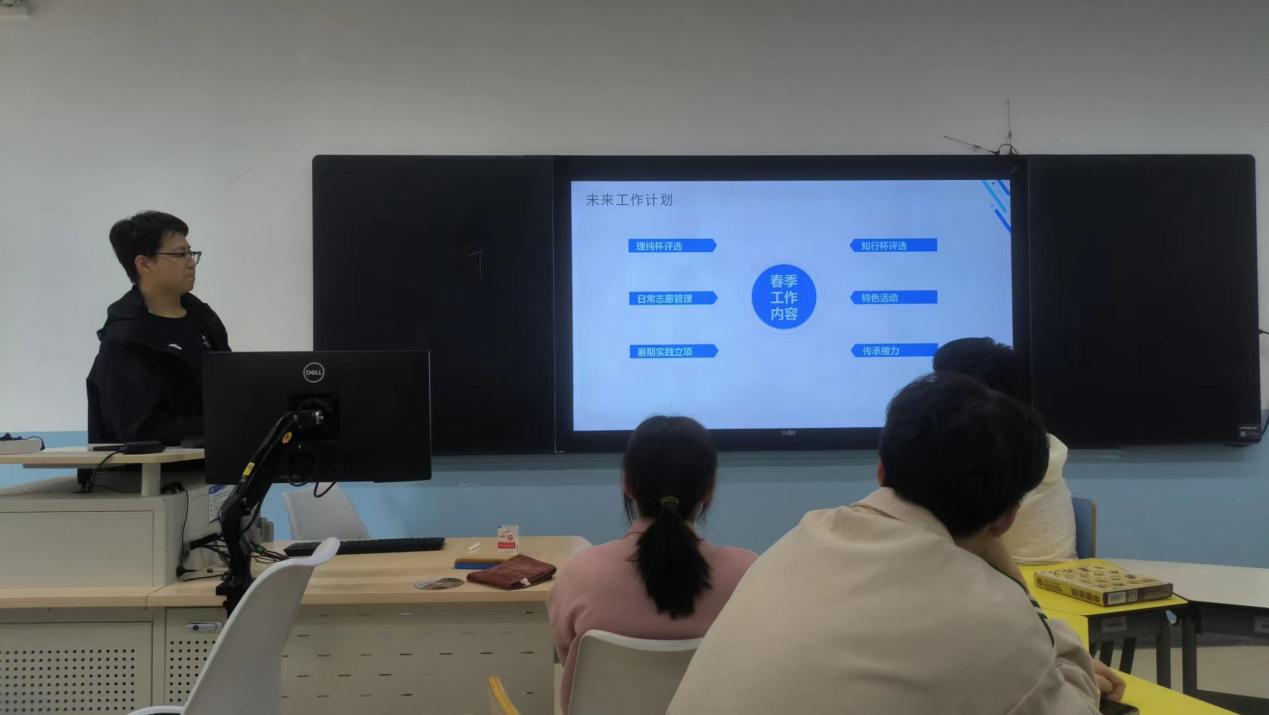 随后,志愿实践部展望未来,对春季学期的工作进行前瞻部署。辅导员苏雨晨、副部长刘志千详细地为大家介绍了本学期的理纯杯、知行杯评比,暑期实践立项等工作计划。部长建议干事们在本学期的工作中以负责人的视角,更全面地看待部门工作,培养自己的组织能力。