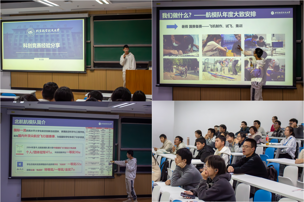 张玉鑫详细介绍了航模队的研究平台、科创资源、赛事活动、团队文化等,并分享了自己参加“冯如杯”赛事、数学物理竞赛的相关经验,鼓励同学敢于突破、提升自我,并作现场答疑。