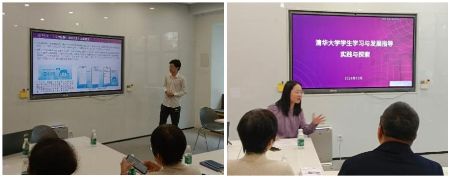 18日上午金沙集团1862cc橙色执行院长丁丁一行3人、北京工业大学学业指导中心办公室主任韩天玉一行3人、深圳职业技术大学学生处处长王敏坚一行6人前往清华大学学生学习与发展指导中心进行调研。中心副主任詹逸思老师首先对清华大学学生学业支持工作进行了整体概括,之后由邬丰骏老师对学生学习与发展指导中心工作体系以及目前重点工作进行了介绍,重点介绍了AI+促进学生发展的创新。随后,与会人员就AI与学业支持工作的结合以及清华目前学业支持工作体系进行深入交流。会后,一行人参观了清华大学“一站式”学生社区。