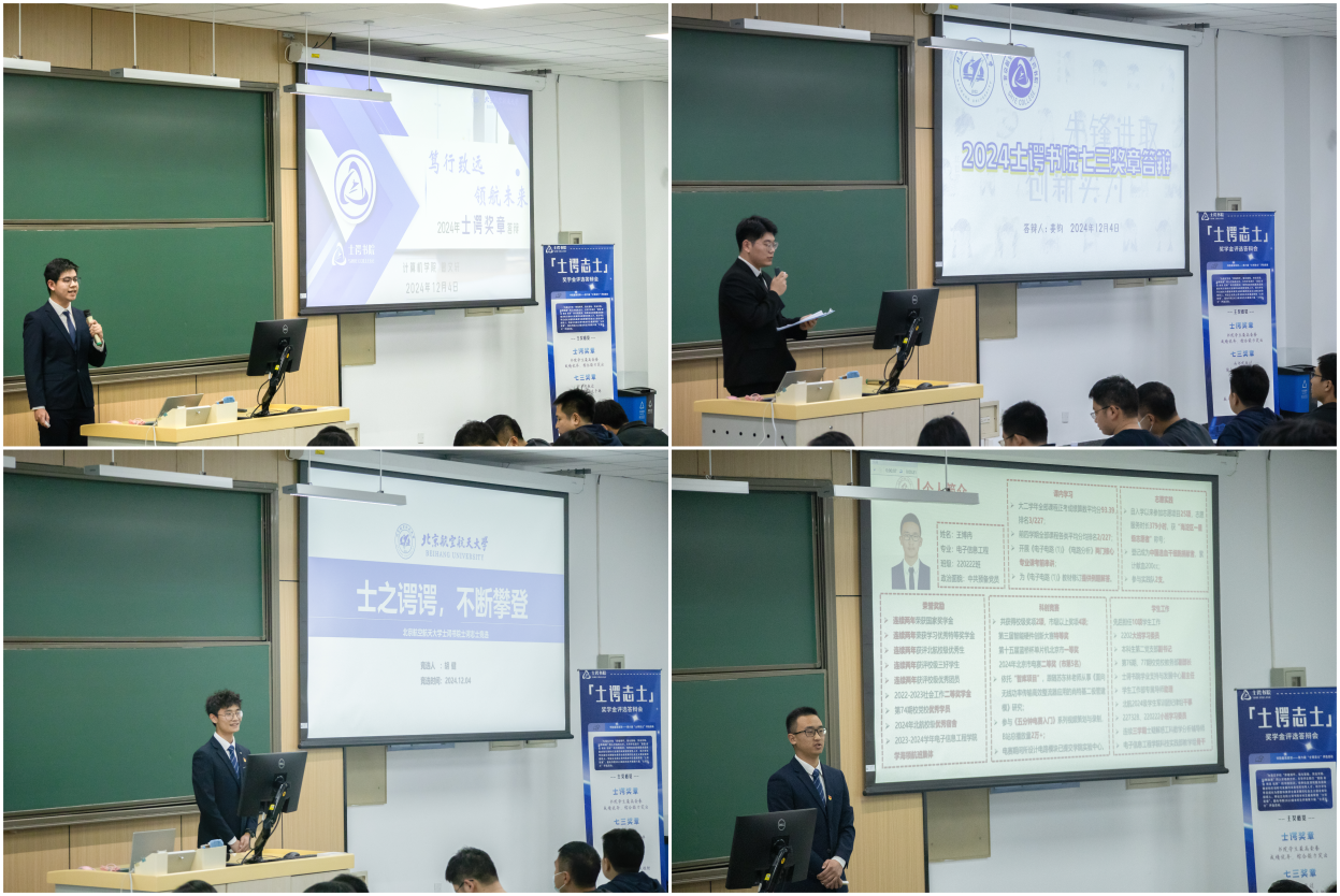 本次答辩会共有11位学生个人和3个学生集体参与。现场首先由主持人介绍“士谔志士”设立背景、答辩规则,随后“士谔奖章”候选人、“七三奖章”候选人和“士谔星云”候选团队依次进行答辩。每位参选者完成答辩后,评委们针对其答辩内容提问并进行评分。答辩现场各项工作推进有条不紊、严谨从容,确保了结果的公正客观。