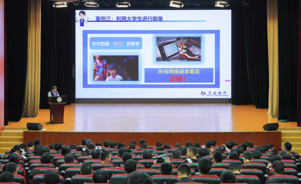 本次反诈知识分享由交通银行北京大兴支行冯杰主讲。他以贴近学生的视角切入,聚焦学生日常高频使用的支付工具,为同学们明确了微信支付、支付宝与银行的本质差异,并解读银行在反诈工作中的“三大核心能力”——“智能防火墙”、“专业拦截防线”和“科普传播力量”。他表示,这三大能力相辅相成、协同发力,为维护金融秩序稳定和群众财产安全提供了坚实保障。