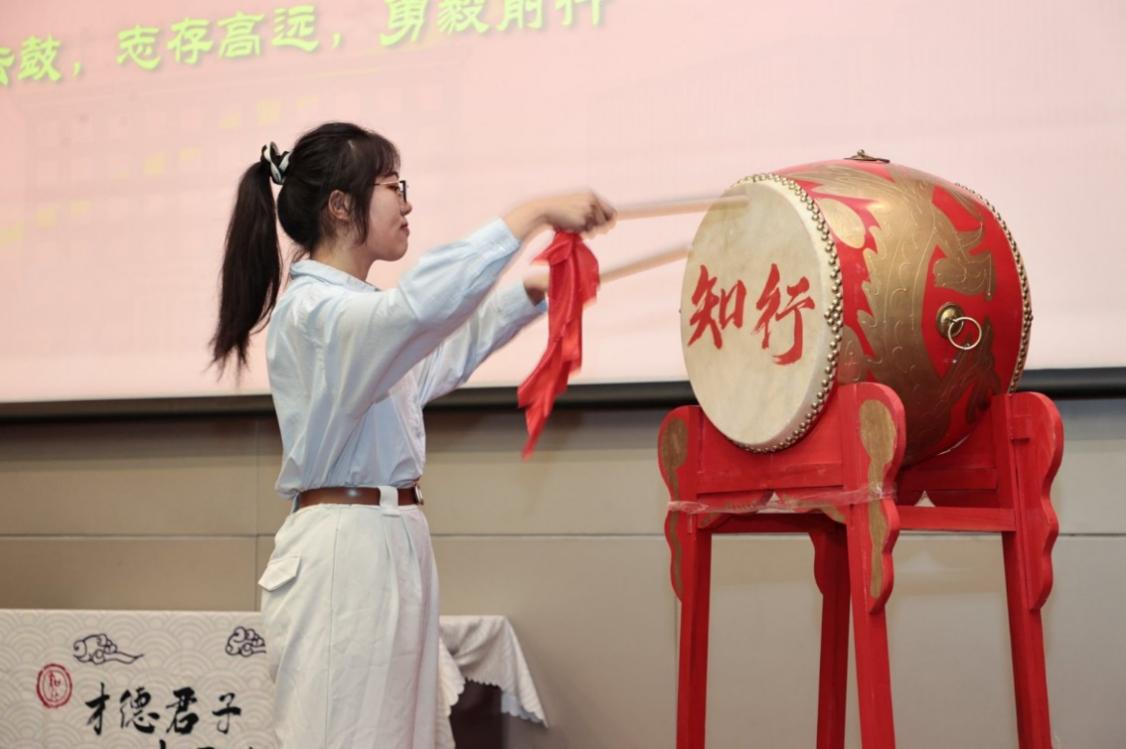 鼓声振振,齐鸣志向。“击鼓明志”环节,知行书院2024级老生代表李开为同学击鼓三次,人文与社会科学高等研究院分团委书记张晓明老师介绍击鼓明志的意义,铿锵鼓声象征着同学们勤学苦读、志存高远、勇毅前行的坚定决心。